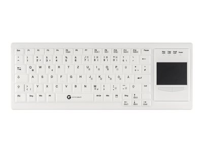 GETT Cleantype Xtra Touch Protect WL kabellose Silikontastatur mit Touchpad IP68 desinfizierbar Farbe weiss Layout DE. Entdecken Sie die CleanType Xtra Touch Protect WL, eine kabellose Tastatur von GETT Gerätetechnik, die Effizienz und Haltbarkeit neu definiert. Mit ihrer kabellosen 2,4-GHz-Konnektivität bietet diese Tastatur ein nahtloses und störungsfreies Benutzererlebnis, perfekt für jeden Arbeitsplatz. Die Tastatur ist mit ihrer verstellbaren Höhe und dem kompakten 75 % TKL-Layout auf Komfort ausgelegt und dank der IP68-Zertifizierung für Staub- und Wasserdichtigkeit für den täglichen Gebrauch ausgelegt. Die Touch Protect WL geht über herkömmliche Tastaturen hinaus, indem sie ein Touchpad integriert, das den Benutzern eine komfortable mausfreie Navigation ermöglicht. Diese Funktion in Kombination mit der Einhaltung der EN60601-1-2 Ed. 4 macht sie zur idealen Wahl für medizinische und gesundheitsbewusste Umgebungen. Ob für den professionellen Einsatz in anspruchsvollen Umgebungen oder für Privatpersonen, die eine zuverlässige und funktionsreiche Tastatur suchen, die CleanType Xtra Touch Protect WL ist eine sinnvolle Investition. – Eingabe / Ausgabe Mäuse & Tastaturen Tastaturen – GETT TKG-083-GCQ-TOUCH-IP68-RF-WHITE-USB